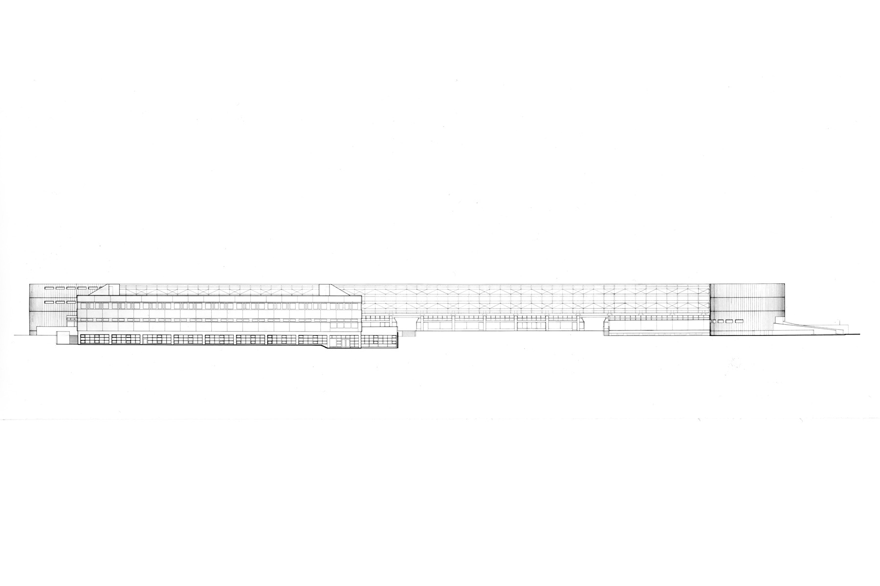 Ein 4-geschossiges Ladenzentrum von 5.000 m2 gegensätzlich konzipiert zum Wohnungsbau. Parkplätze im Obergeschoss sind über Brücken mit der zweihüftigen Ladenanlage mit Straßencharakter im Innenbereich verbunden. Die Farbgebung der Parkdeckverkleidung aus Eternit-Sichtblenden war ein dunkelrot/dunkelgrün Rombenmuster.